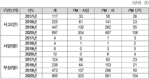개인형이동장치 교통사고는 2017년 117건에서 2018년 225건, 2019년 447건, 2020년 897건으로 3년 새 7.5배 이상 증가한 것으로 드러났다.