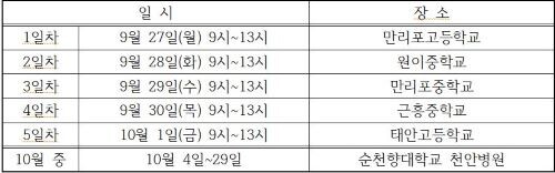 | ▲태안 유류 피해지역 어린이ㆍ청소년 대상 건강영향조사 일정 (사진= 순천향대 천안병원 제공) |