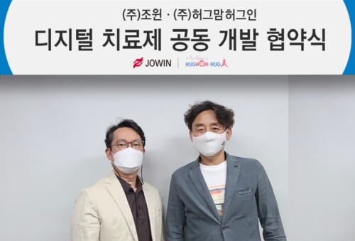 | ▲ 디지털 치료제 공동개발에 협약한 조윈 차지운 대표(왼쪽)과 허그맘허그인 최양구 대표(오른쪽)] (사진=조원 제공) |