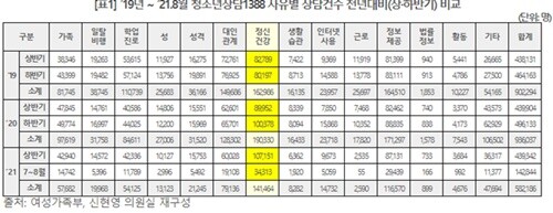 국회 보건복지위원회 소속 더불어민주당 신현영 의원이 여성가족부로부터 제출받은 ‘청소년 1388 상담건수’에 따르면 2021년 8월까지 ‘정신건강’ 항목의 상담 건수는 14만1464건으로 월 평균 1만7683건이었다.