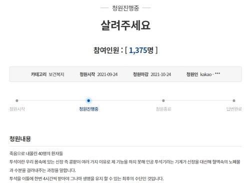 24일에는 올해 5월 초 투석을 시작했다는 B씨의 ‘살려주세요’라는 제목의 청원글이 이어졌다.